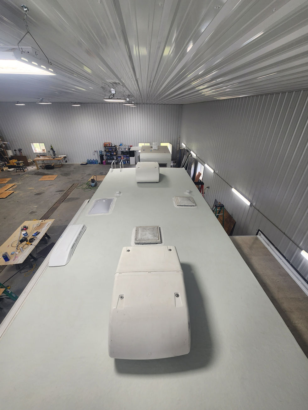 This Chateau arrived with severe water damage in the ceiling and cabover. In order to restore the cabover, our team removed the water damaged material, treated the cabover for mold, rebuilt the framing and walls, installed insulation, installed wall sheeting and trim that matched the rest of the Class C, repaired damaged fiberglass, and ensured everything was watertight to prevent future water damage.
